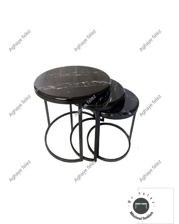 میز جلومبلی و پذیرایی مجموعه 3 عددی میز سایز کوکچک به قطر 35 و ارتفاع 42/ میز سایز متوسط به قطر 40 و ارتفاع 46/ میز سایز بزرگ به قطر 50 و ارتفاع 52 می باشد رنگ این میز از نوع کوره ای الکترواستاتیک است و مقاومت بالایی دارد. جنس صفحات ام دی اف طرح سنگ میباشد که با انواع مواد شوینده قابل شستشو است.
